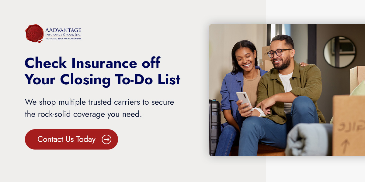 If you need help with the homeowners insurance process, AAdvantage Insurance Group can support you. As local, independent advisors, we shop multiple trusted carriers to secure the rock-solid coverage you need. Contact us before your closing date for a personalized quote.